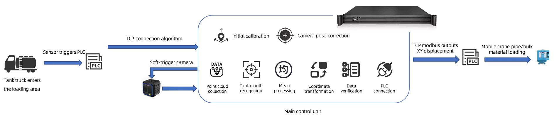 LuminWave’s ToF camera delivers exactly that. With millimeter-level accuracy and robust performance even in challenging conditions, it quickly identifies the filling-port’s position and shape, guiding the discharge nozzle into perfect alignment. Suitable for both solid materials like coal and ore, as well as liquids like hydrochloric acid and petroleum, our technology enables fully automated, efficient, and safer loading operations.